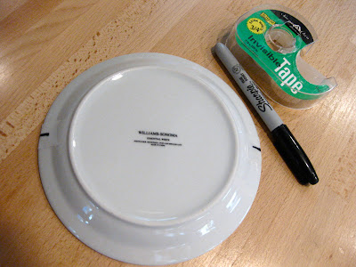 Line up your marks with the straight edge of your fabric (or on a straight line that you have measured out) and trace around your plate with a pencil or chalk. Cut out your scallops. You will have to make a "guesstimate" of how many scallops you want and at what size. This will vary depending on the collar of your sweater, the size and how you want to place them. Play with it and see what works for you.