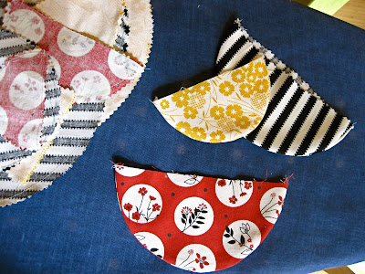 To make 1 scallop, place two of the same size and same fabric pieces with rights sides together and sew only on the curve.